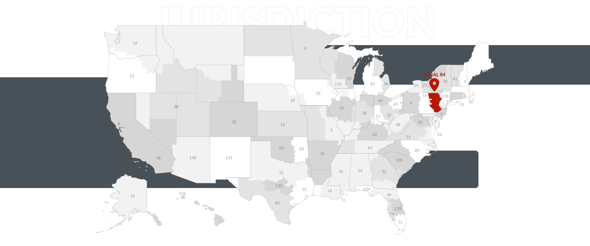 The map above shows the United States of America, with IUEC Local 84’s jurisdiction, headquartered in Pennsylvania, highlighted in red. The Local’s jurisdiction is composed of 17 Pennsylvania counties, two of which are shared with Local 59, and 2 counties in New Jersey.